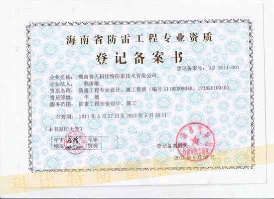 湖南普天科比特防雷技術(shù)有限公司防雷工程專(zhuān)業(yè)設(shè)計(jì)甲級(jí)資質(zhì)證編號(hào):11182009046),總第11061,有效期至2013年05月26日已按規(guī)定程序在海南省氣象主管機(jī)構(gòu)進(jìn)行防雷工程專(zhuān)業(yè)設(shè)計(jì)、施工等級(jí)備案。有效期自2012年05月27日至2013年05月26日。