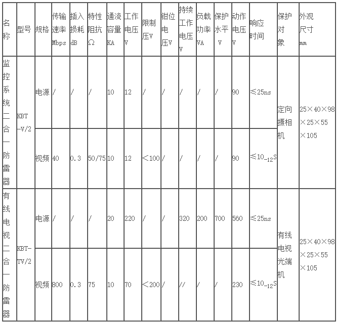 二合一監控多功能防雷器(KBT-V2/12) 型號:KBT-V2/12 價格:面議 產品介紹:
