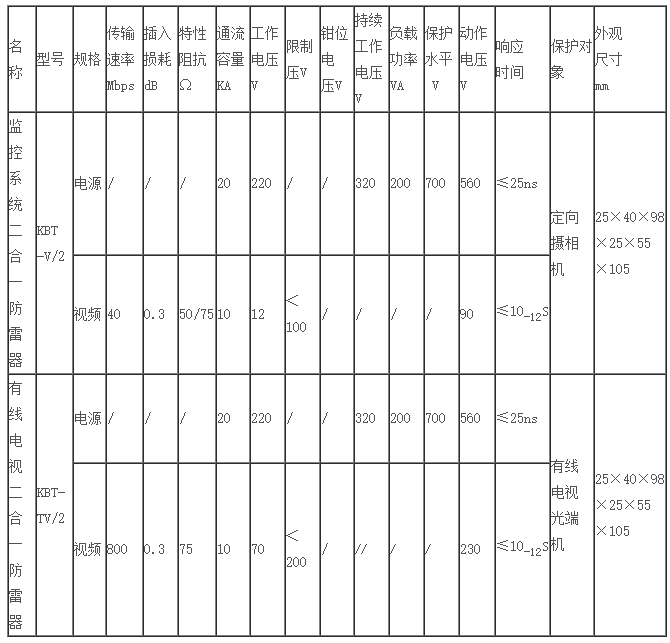 KBT-V2二合一監控多功能防雷器采用BNC視頻接口,適用普通攝像機、固定攝像機、紅外機的防雷保護。電源工作電壓分24V(交、直流通用),信號工作電壓為6-12V。