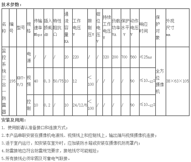 KBT-V3三合一防雷器根據監控系統的特點量身打造的專用防雷設備,它集電源防雷器、視頻線路防雷器和控制線路防雷器于一體,各部分均采用多級串聯式結構設計,具有多級保護功能。適用于公共場所、各種樓宇、機場、海關、軍事基地等各種重要安防設施的室內、室外監控攝像槍的防雷擊電磁脈沖保護。三合一防雷器用于帶云臺攝像槍,安裝在監控系統前端的攝像機尾部,位置與攝像機越近越好,并做好接地處理,接地電阻應符合標準的要求。