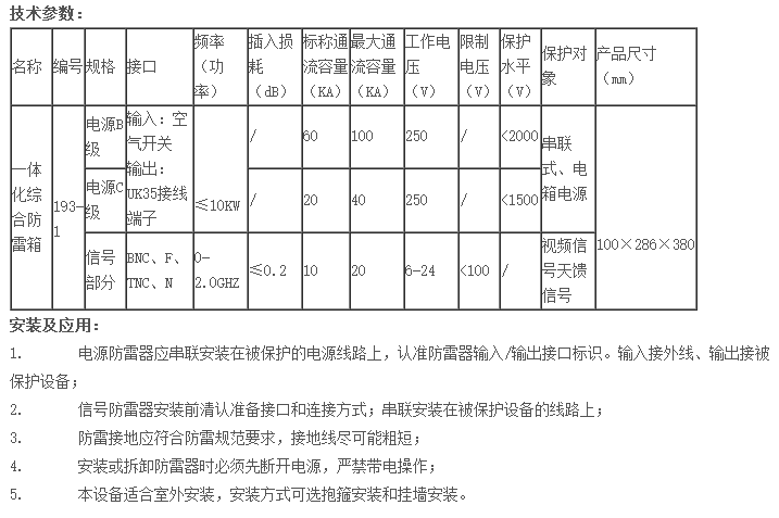 1.一體化綜合防雷箱電源防護、信號防護及等電位接地于一體;